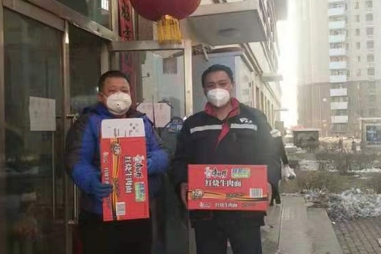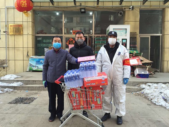 康居家園公租房好心住戶,第一時間把2箱84消毒液、100個口罩送到了項目經(jīng)理手中,便利店工作人員送來了方便面。祥和苑公租房不愿留下姓名的業(yè)主把方便面、牛奶、礦泉水放到了秩序維護(hù)部?;菪略饭夥恐驹刚邚堖M(jìn)軍捐贈了25千克消毒液、20雙勞保手套。兄弟單位金橋熱網(wǎng)分公司為物業(yè)工作人員提供了護(hù)目鏡。