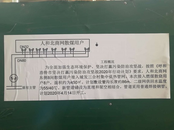 按照《呼和浩特市堅(jiān)決打贏污染防治攻堅(jiān)戰(zhàn)2020年行動(dòng)計(jì)劃》總體要求,該項(xiàng)目接入燃煤散燒用戶42戶,面積約2450平方米,其中一家村豐州路西34戶,2000平方米;人和北商網(wǎng)8戶,450平方米。該項(xiàng)目計(jì)劃敷設(shè)管線溝槽長(zhǎng)度約174米,其中一家村豐州路西為88米,人和北商網(wǎng)為86米。新管道鋪設(shè)以直埋和架空相結(jié)合的方式,全部采用普通焊接鋼管,開工時(shí)間為2020年4月14日。