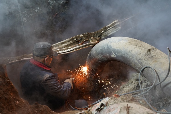 "找到啦!"隨著一聲驚呼,一條約20公分長(zhǎng)的裂口,赫然出現(xiàn)在人們面前。雖然當(dāng)時(shí)已經(jīng)是晚上8點(diǎn)多,室外的氣溫也在持續(xù)下降,為了盡快恢復(fù)供熱,大家沒(méi)有休息,馬不停蹄的開(kāi)始了緊張的堵漏工作。經(jīng)過(guò)一夜的奮戰(zhàn),終于在23日早6點(diǎn)半結(jié)束搶修,開(kāi)始注水。在停暖15個(gè)小時(shí)后,恢復(fù)正常供熱,確保了62萬(wàn)平米內(nèi)的熱用戶(hù)家中溫度及時(shí)上升。