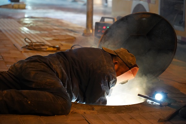 坑里挖的熱火朝天,坑外的工作人員也不停歇的忙著。在距離開(kāi)挖點(diǎn)2米的一個(gè)管道井,一位師傅正趴在井口旁邊,上半身倒栽在進(jìn)井口,焊接著距離井口半米遠(yuǎn)的排氣閥門(mén),筆者站在遠(yuǎn)處,都能聞到濃濃的電焊味道,而作業(yè)的師傅也被電焊產(chǎn)生的煙氣嗆得不停的流眼淚,時(shí)不時(shí)地從井口起身?yè)Q口氣。