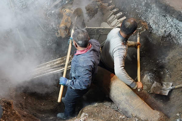 筆者于晚間6:00抵達(dá)搶修現(xiàn)場(chǎng)時(shí),大老遠(yuǎn)地就看見(jiàn)沿路的井蓋都冒著白色的水蒸氣,進(jìn)入搶修現(xiàn)場(chǎng),筆者看到,橋靠分公司總經(jīng)理阮強(qiáng)、副總經(jīng)理張國(guó)良、運(yùn)營(yíng)四所所長(zhǎng)馮俊及公用事業(yè)管理局相關(guān)領(lǐng)導(dǎo)在現(xiàn)場(chǎng)緊鑼密鼓地指揮著搶修。現(xiàn)場(chǎng)兩個(gè)搶修師傅正在一個(gè)10平方米、2米多深的大坑中,一鍬一鍬地奮力挖著坑內(nèi)的土,現(xiàn)場(chǎng)工作人員介紹到,因?yàn)橐呀?jīng)接近管道,為確保管道的安全,目前只能人工挖掘。當(dāng)時(shí)的室外溫度在-11℃,工人們卻是滿(mǎn)頭大汗。