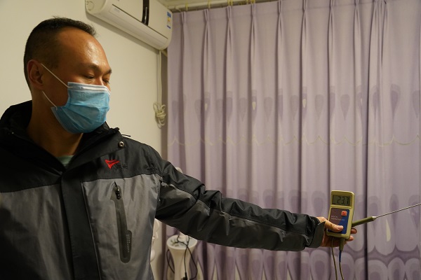 在20號樓3單元6樓的住戶家中,劉婷用手摸了摸用戶家的地板磚,通過人體的直觀感受,發(fā)現用戶家地暖存在散熱不均勻的現象。客服管家用專業(yè)的測溫儀和熱成像儀,進行了測溫。經檢測,該用戶家各房間平均溫度均在23℃以上。用戶說,家中較冷的房間是廚房,客服管家又針對廚房進行了測溫,發(fā)現室溫要比其他房間溫度低一些,但熱成像儀測得的結果與其他房間一致。經過觀察與分析,發(fā)現用戶家廚房與陽臺間的隔斷是一扇落地大玻璃門,保溫效果較差,導致廚房溫度低于其他房間。聽了工作人員的講解,用戶也表示了認可,對我們的排查結果及服務態(tài)度表示滿意。