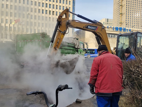 在鄂爾多斯東街龍谷華庭和銀聯(lián)大廈樓前臨街道路欄桿旁,緊靠人行道的一臺挖掘機正發(fā)出轟鳴聲,地溝內(nèi)不斷冒出騰騰熱氣這是1月2日下午15:00,在該地段搶修一次管網(wǎng)的畫面。當(dāng)日,熱心市民發(fā)現(xiàn)該處路段人行道有熱水冒出。城發(fā)橋靠分公司第六運營所工作人員接到熱線通知后,立即趕往現(xiàn)場。經(jīng)測水溫為74℃,確定為一次網(wǎng)漏水。所長耿焱立即逐級上報,并安排所部人員對漏點進行現(xiàn)場安全防護,同時對漏點情況進行觀察。