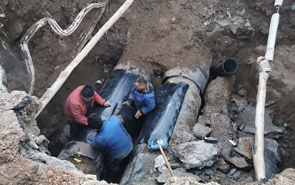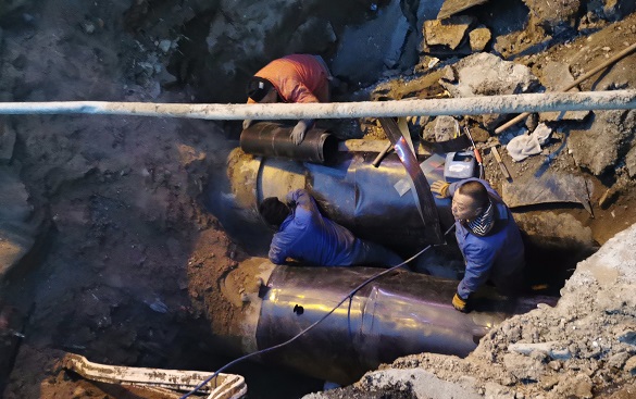 在場人員研究制定了搶修方案,決定不更換管道,而采用"包裹式"的方式進行修復(fù)--在原DN700的老舊管道上包裹DN800的管套封堵漏點,將DN800的管道切割成兩部分,分別安裝,與水泥管道接近的部分打磨成壁度在4公分以內(nèi)的管壁,焊接后進行管道碰口。當(dāng)時,室外溫度已降至-15℃,地溝內(nèi)溫度高,地面溫度低,施工難度大。為保證快速、高效、安全完成新管套接,搶修人員只能手提工具沿著管道貓著腰爬到連接處,窩在管道下方,在管套與管網(wǎng)連接處焊接。