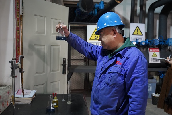 在水化A車間,劉丁一穿上工作服,戴上防護用具,立刻進入工作狀態(tài)?;灩ぷ骺菰锓ξ?,但對質量的要求卻精益求精,從接樣到測量再到數(shù)據(jù)分析,他嫻熟地倒著試劑、觀察著試劑瓶,一支燒瓶、一些水、幾滴試劑,隨著劉丁一搖晃的燒瓶,漸漸的,瓶子中的水從紫紅色,變成了淺藍色。為了檢驗軟化水的質量是否達標,確保鍋爐一次網(wǎng)用水安全,這一天他要對水質至少進行8次檢驗。