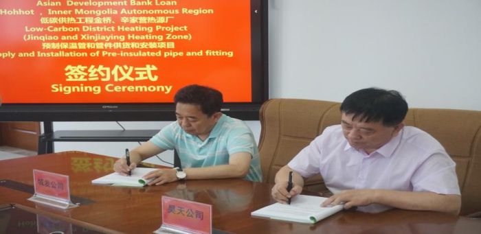 7月7日上午,內(nèi)蒙古呼和浩特市低碳供熱亞行貸款項目呼和浩特市城發(fā)投資有限責任公司金橋、辛家營區(qū)域集中供熱工程第7包(金橋熱源廠預(yù)制保溫管和管件3)、第9包(辛家營熱源廠預(yù)制保溫管和管件2)采購合同簽約。