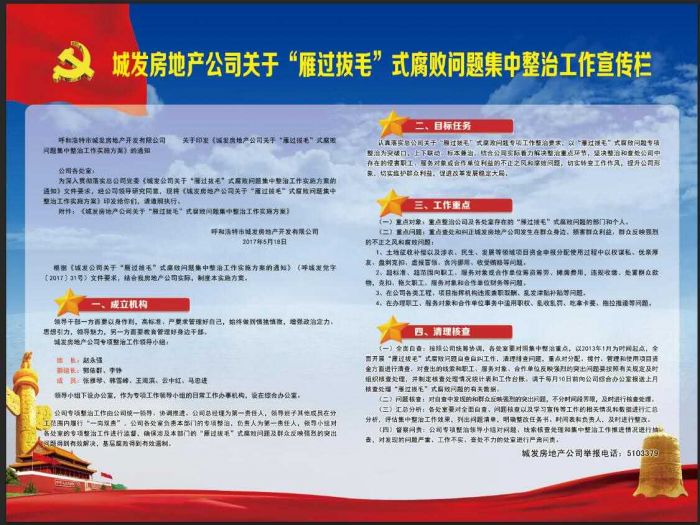 從5月開始,按照市委市政府要求,城發(fā)公司開展了“雁過(guò)拔毛”式腐敗問(wèn)題集中整治工作,公司高度重視集中整治的宣傳和自查工作,并將其作為集中整治“雁過(guò)拔毛”式腐敗問(wèn)題的重要任務(wù),精心組織、迅速行動(dòng),總公司制訂了《城發(fā)公司關(guān)于“雁過(guò)拔毛”式腐敗問(wèn)題集中整治工作宣傳方案》,各分子公司都結(jié)合自身實(shí)際制訂了可操作性強(qiáng)的宣傳方案,讓廣大職工群眾知曉并支持,參與集中整治。公司通過(guò)總公司及分子公司各級(jí)網(wǎng)站、微博、微信公眾號(hào)、微信群、LED大屏幕、LED條屏、噴繪宣傳板、條幅、宣傳欄、動(dòng)員會(huì)議面對(duì)面宣傳等10多種載體和形式,30多幅宣傳內(nèi)容認(rèn)真進(jìn)行了宣傳,確保把集中整治“雁過(guò)拔毛”式腐敗問(wèn)題工作深入宣傳至一線干部職工中,讓廣大干部職工及群眾充分了解并參與到宣傳工作中,通過(guò)廣大干部職工將宣傳活動(dòng)輻射到千家萬(wàn)戶,提高了社會(huì)群眾對(duì)集中整治“雁過(guò)拔毛”式腐敗問(wèn)題工作的知曉度。